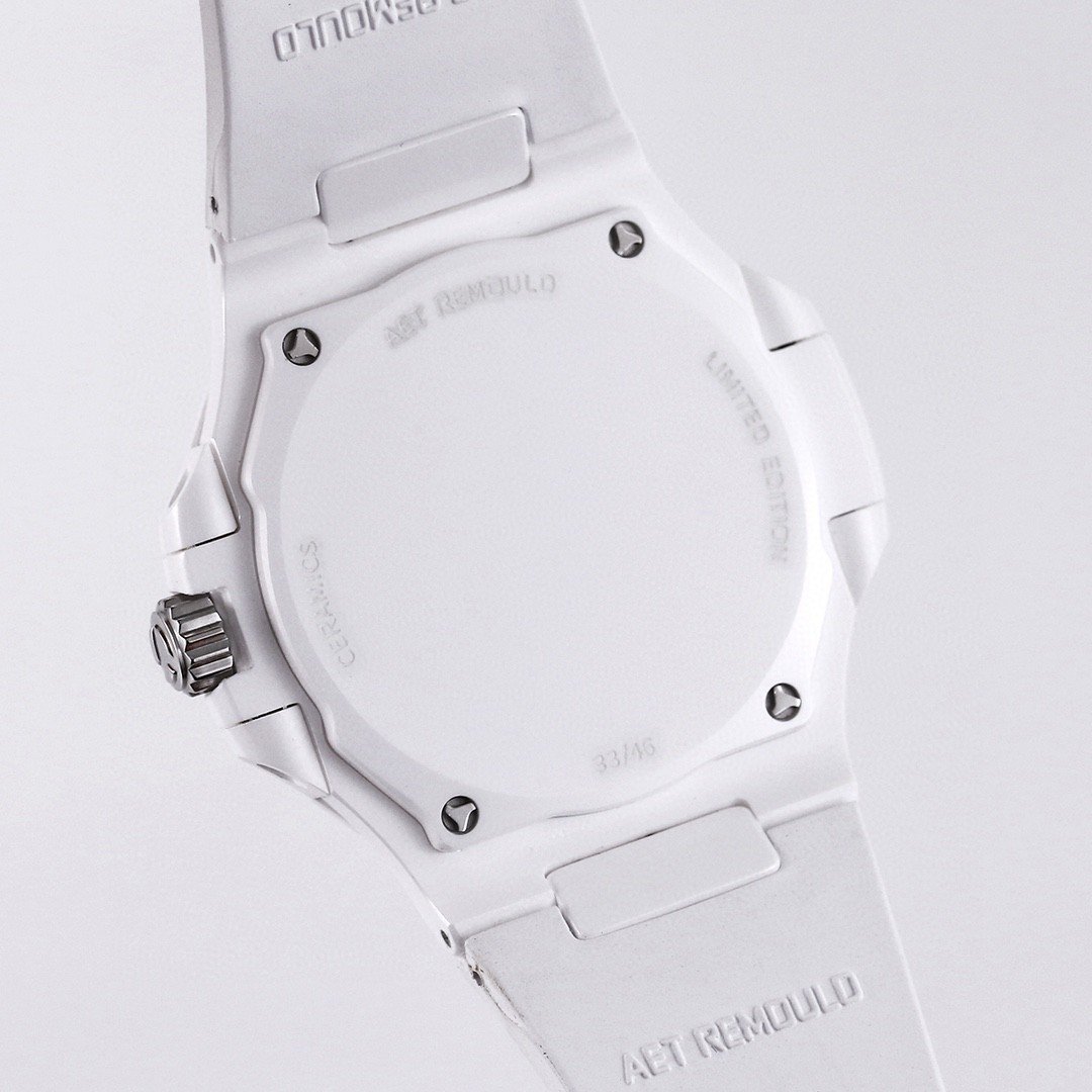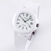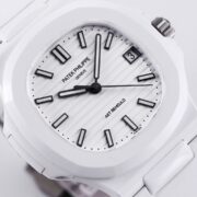 AET remould Patek Philippe ceramic white dial with strap is a 1:1 superclone watch. It is made with the same materials and to the same specifications as the genuine Patek Philippe Nautilus 5711/1A-018, except for the movement, which is a cloned movement instead of the genuine Patek Philippe Calibre 26-330 S C.