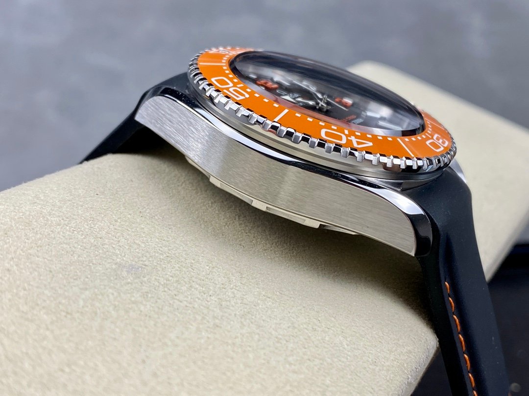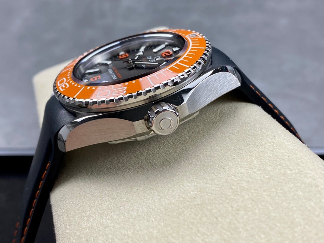Omega Planet Ocean 6000M COAXIAL MASTER CHRONOMETER 45.5 MM Ultra Deep 215.32.46.21.06.001 1:1 Superclone on Rubber strap is a Superclone watch that is made to closely resemble the original Omega Seamaster Planet Ocean Ultra Deep watch. It has a 45.5mm case made of OMEGASTEEL, a black ceramic bezel with a diving scale in Liquidmetal, a sapphire crystal, and a rubber strap. The watch is powered by the VS3135 automatic movement, which is a clone of the original Omega Co-Axial Master Chronometer Calibre 8912 movement.