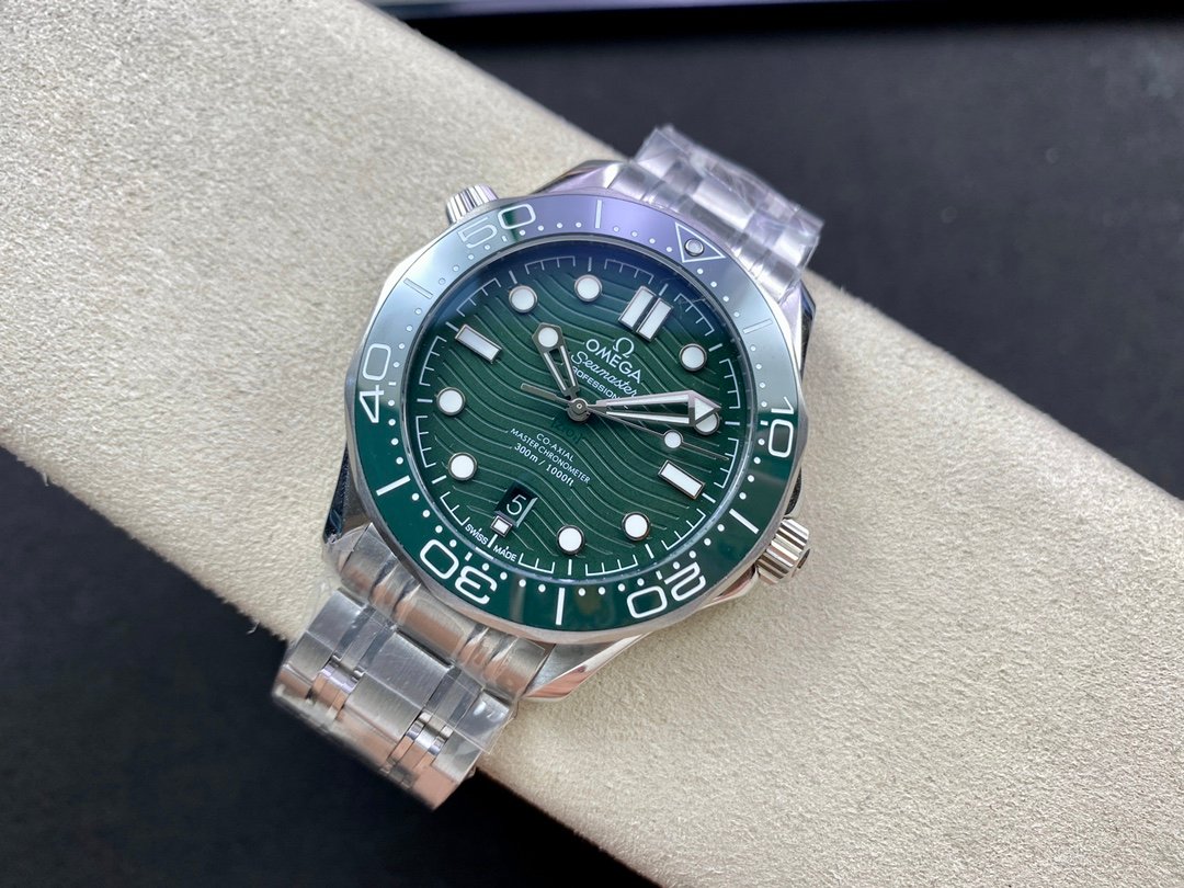 OMEGA Seamaster Diver 300M 42mm Green Dial is a high-quality 1:1 Superclone watch that is very close to the original. It has a 42mm stainless steel case, a silver ceramic bezel, a Green dial with wave pattern, and a date window at 6 o'clock. The watch is powered by a Swiss Eta automatic movement that is decorated to look like the Omega Co-Axial Master Chronometer movement. The watch also has a sapphire crystal and a water resistance of 300 meters.