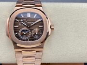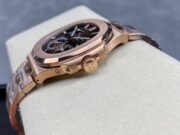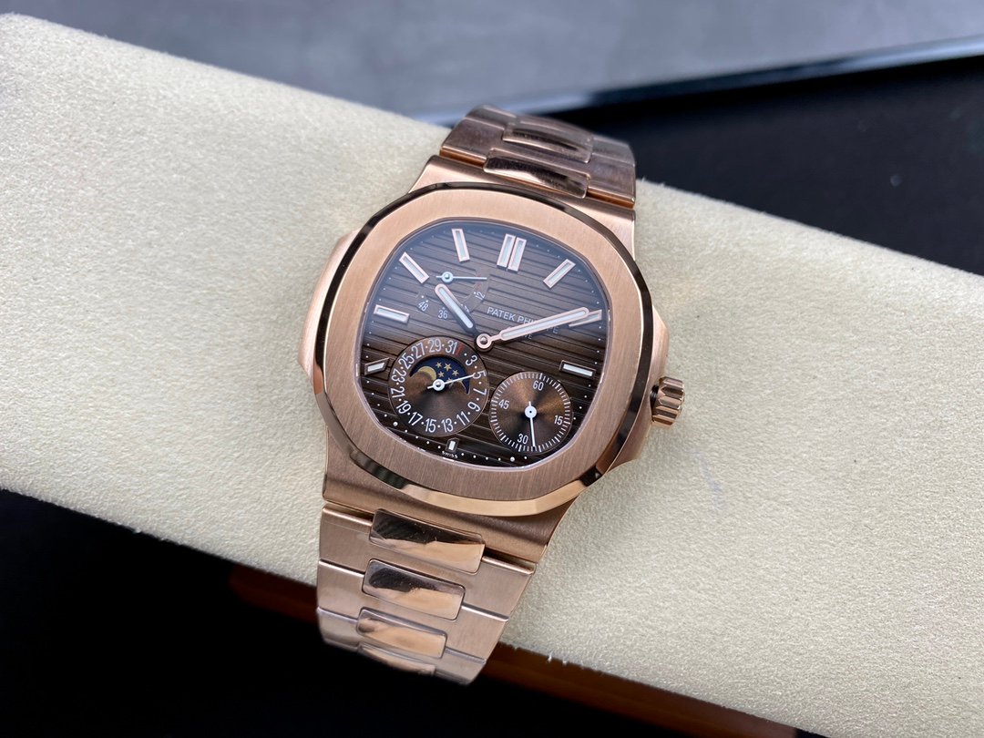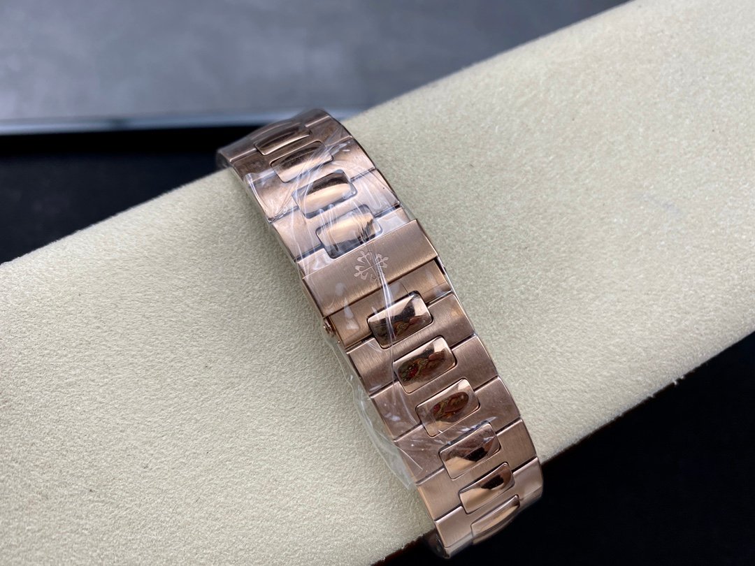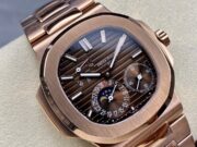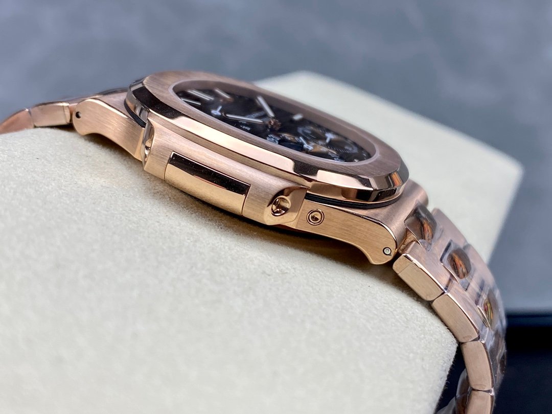 Patek Philippe Nautilus 5712R-001 18K Rose Gold. It is made with the same materials and to the same specifications as the genuine watch, except for the movement, which is a cloned movement instead of the genuine Patek Philippe Calibre 240 PS IRM C LU.
