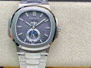 Patek Philippe Nautilus Annual Calendar 5726. It is a high-quality 1:1 Superclone of the original Patek Philippe Nautilus Annual Calendar 5726. The watch has a stainless steel case, a Grey dial, and a self-winding movement. It is water resistant to 120 meters.