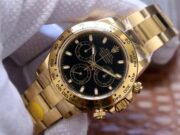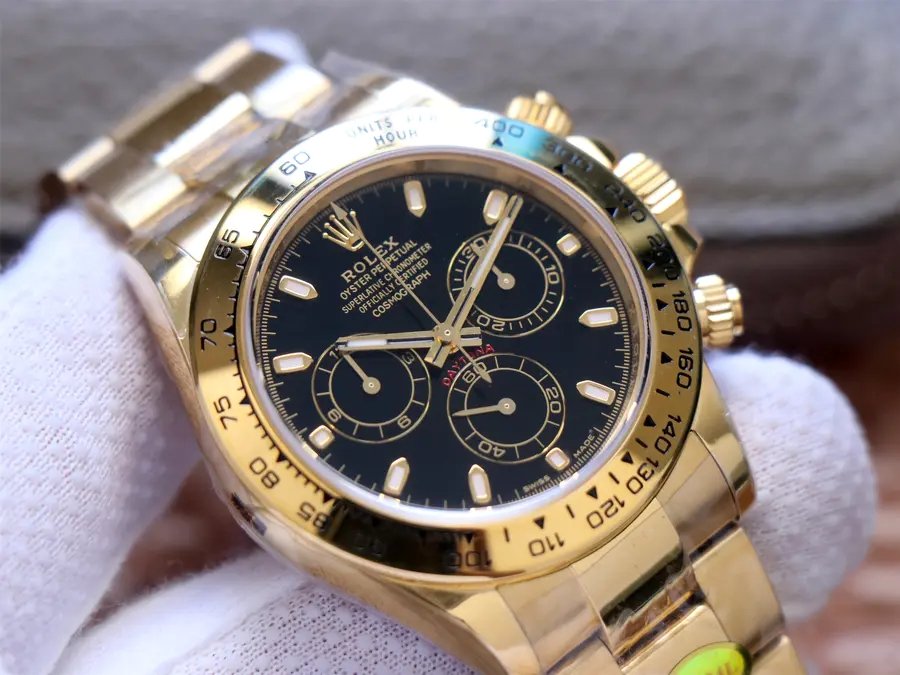 18K Yellow Gold Plating on 904 Solid Stainless Case with Rolex Markings and Engravings like the Authentic.The Best Rolex Daytona Model Replicated up to Date. The First Rolex model to adopt a 904L Steel on Casing and Strap which is the same steel used by Rolex. Compared with an Original Side by Side and there were NO Differences Whatsoever. Complete list of details have been stated below and you will see that tremendous amount of detaiing and work has been put into this edition.