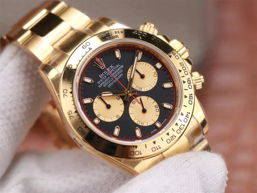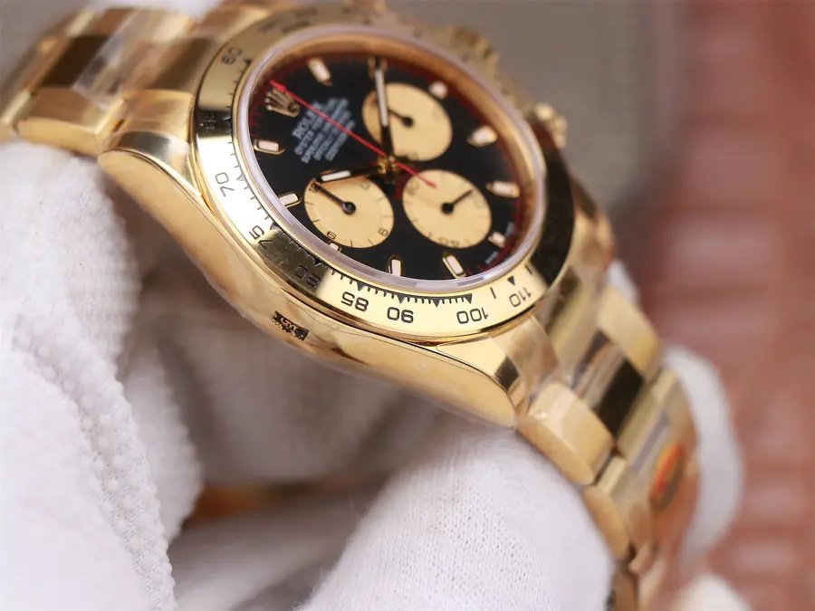 18K Yellow Gold Plating on 904 Solid Stainless Case with Rolex Markings and Engravings like the Authentic.The Best Rolex Daytona Model Replicated up to Date. The First Rolex model to adopt a 904L Steel on Casing and Strap which is the same steel used by Rolex. Compared with an Original Side by Side and there were NO Differences Whatsoever. Complete list of details have been stated below and you will see that tremendous amount of detaiing and work has been put into this edition.